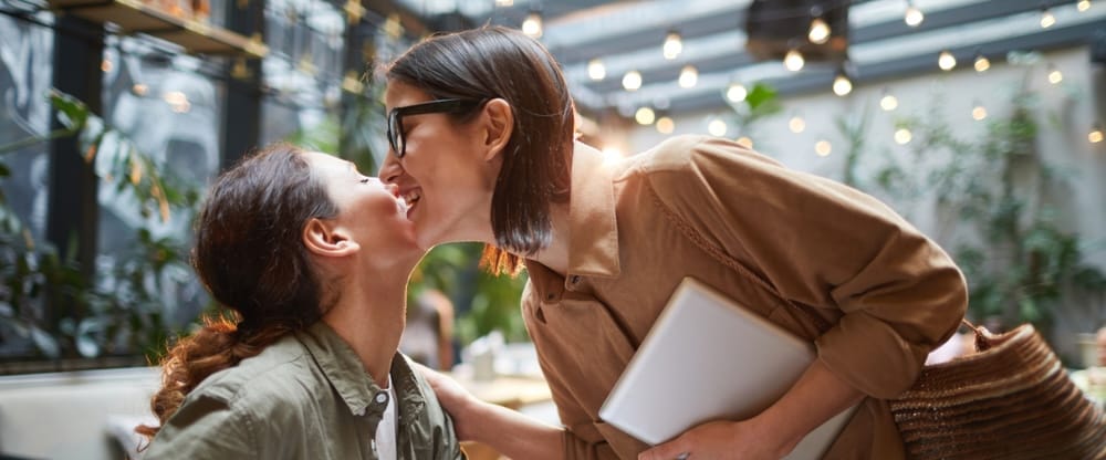 The standard: two kisses on the cheeks. Right cheek first, then left. This is the default greeting between women, and between men and women, when you know each other socially. They're light touches, not full lip-on-cheek contact. Think brush-and-air-kiss. This is how you greet friends, your partner's friends, neighbours you're on first-name terms with, and pretty much anyone at a social gathering where you've met at least once before.